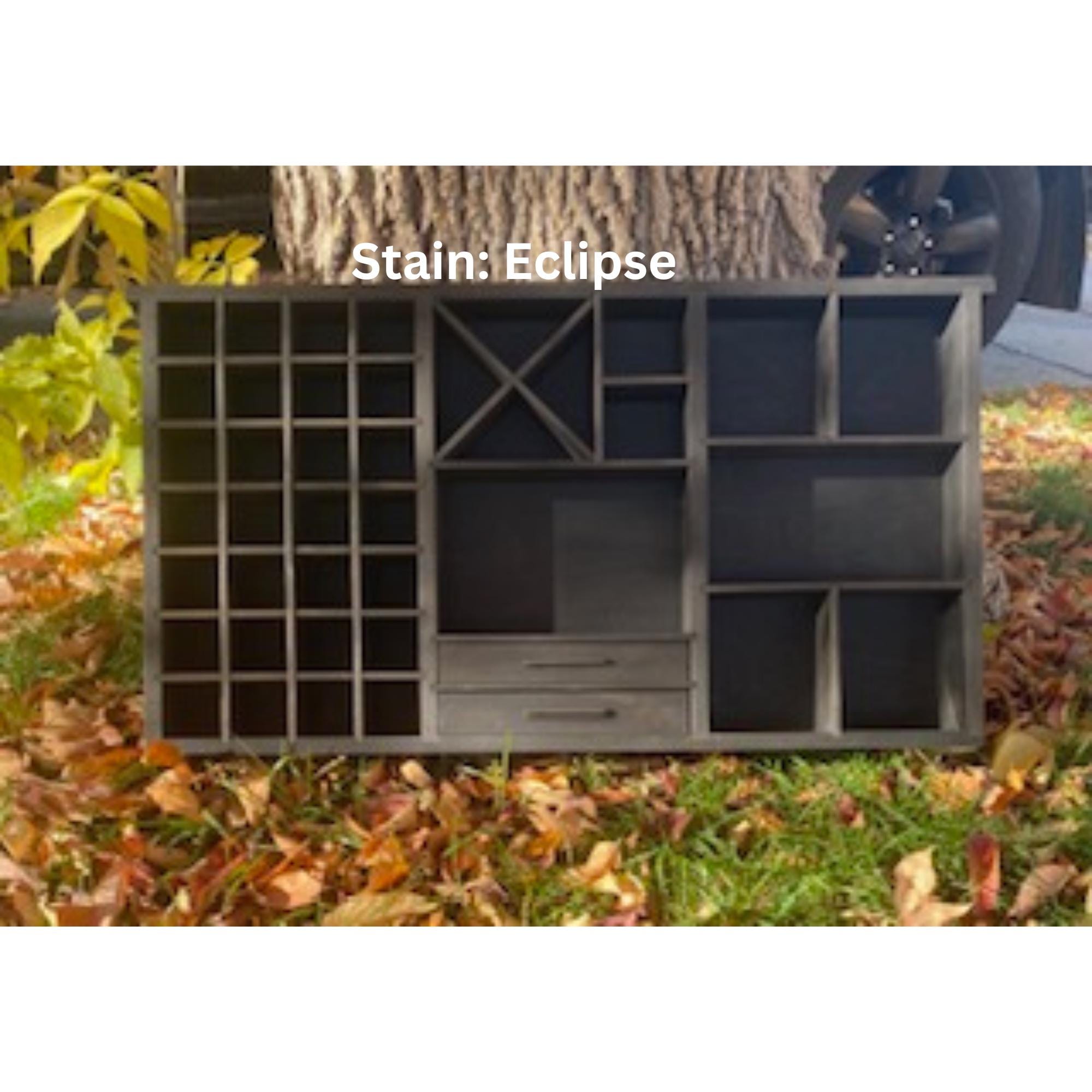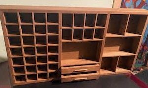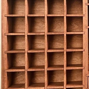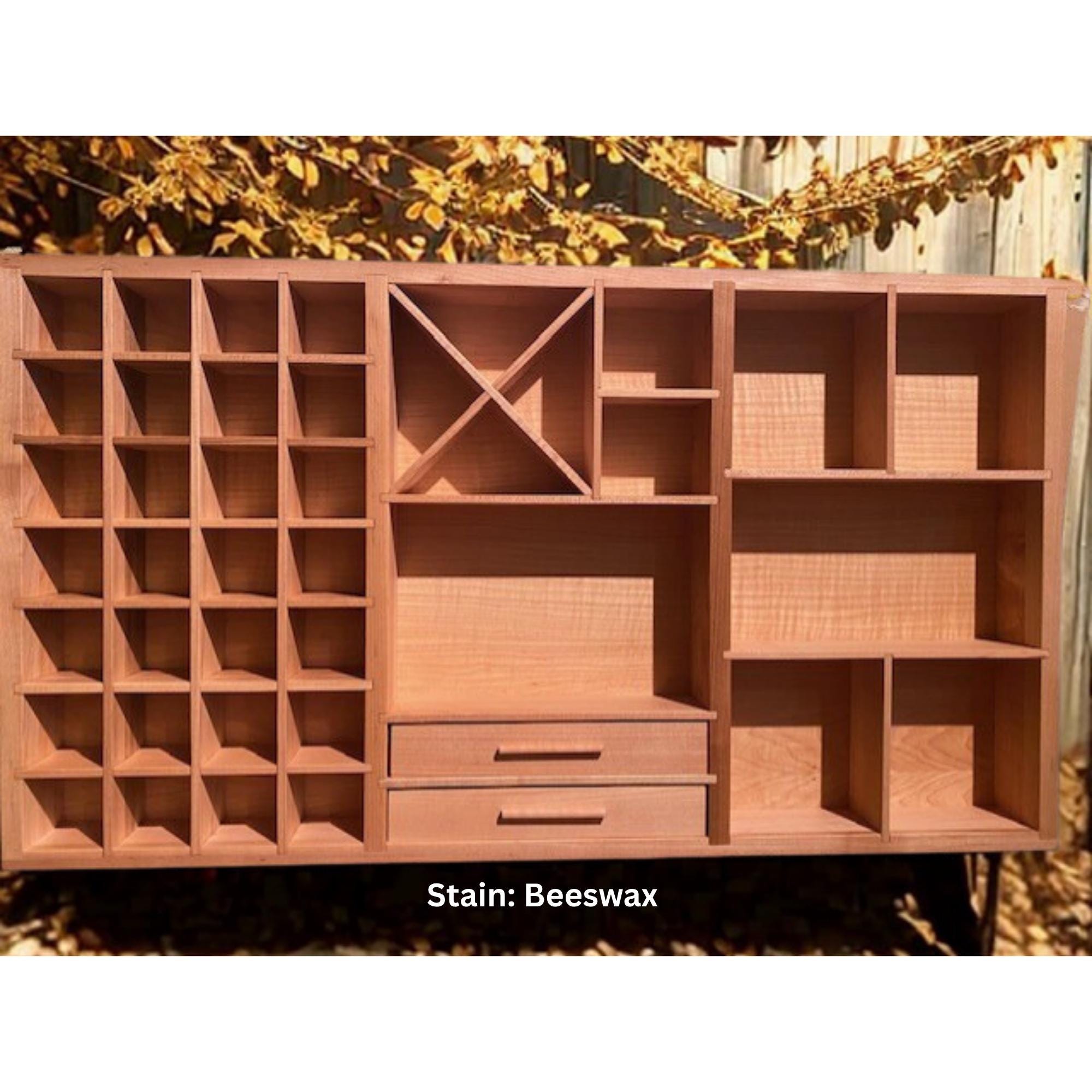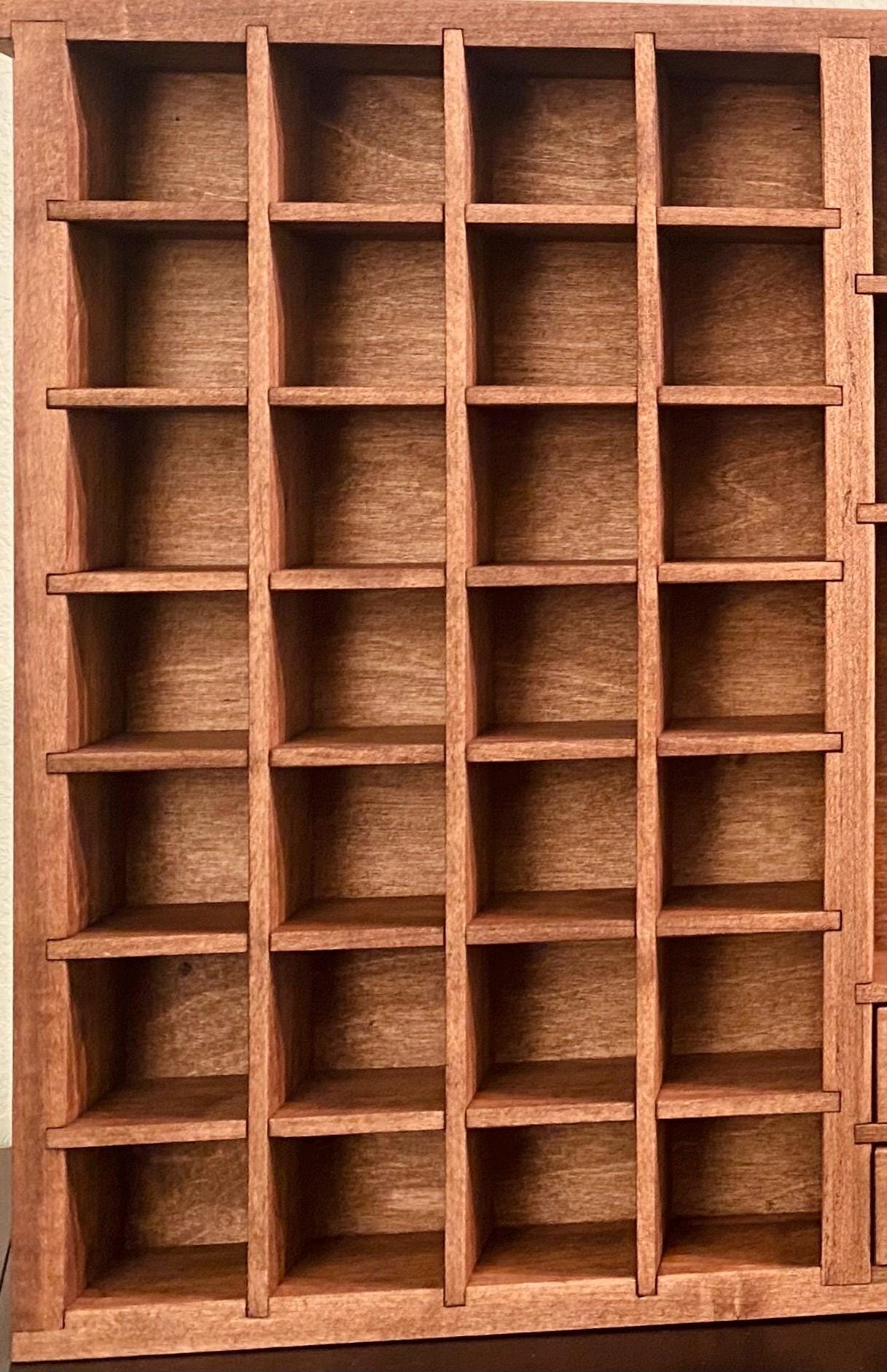 Showcase your treasures with this handcrafted, wall-mounted display shelf. Solid wood construction. Designed to hold your most cherished small items, this versatile organizer features 44 compartments in varying sizes- perfect for crystals, nature finds, miniatures, tincture bottles, and other collectables.