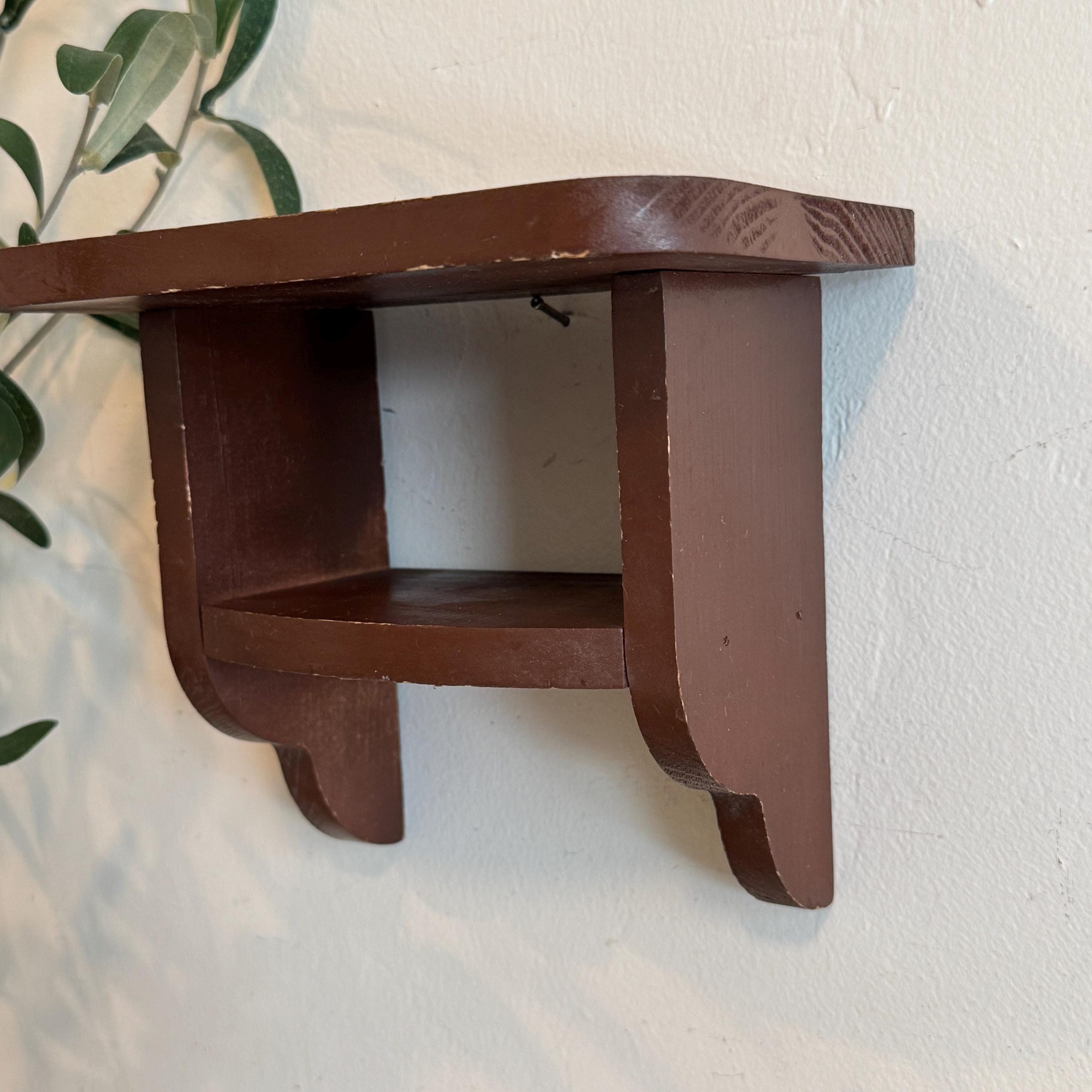 Vintage wood shelf with hand cut bracket details and aged patina, solid wooden wall mounted display shelf.